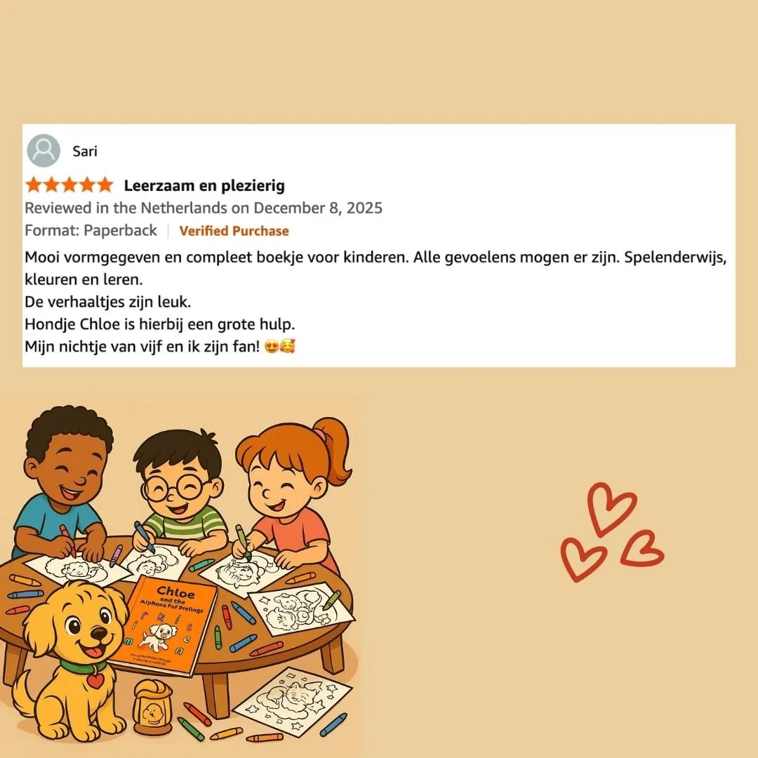 Het verwoordt precies waar Chloe’s Wereld voor bedoeld is: een zachte, speelse manier voor kinderen om gevoelens te ontdekken, via verhalen en kleuren.